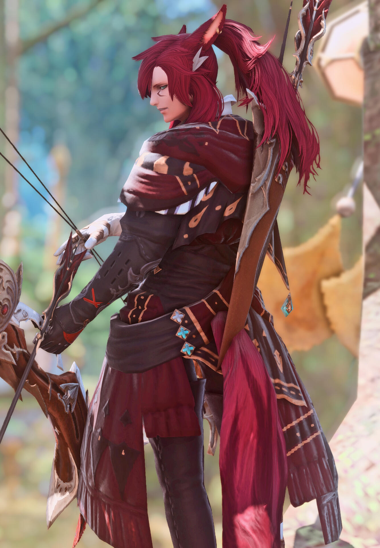 appearance: Mel is tall for a Keeper, some of his elezen blood stretching him out, but otherwise has an athletic build he keeps in shape. His hair is a dark, rich red with white growing in from a surge of White Magic during the Dragonsong war. His eyes are naturally green but his right eye is red since forging a pact with Midgarsormr. He is extremely fluffy, with a bushy tail and large, soft ears.
